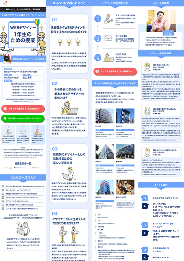 デザイン系のLPなので、業界で良く使われているカラーの青系を中心に配色しました。青系の配色は落ち着きが有り信頼性が有ります。